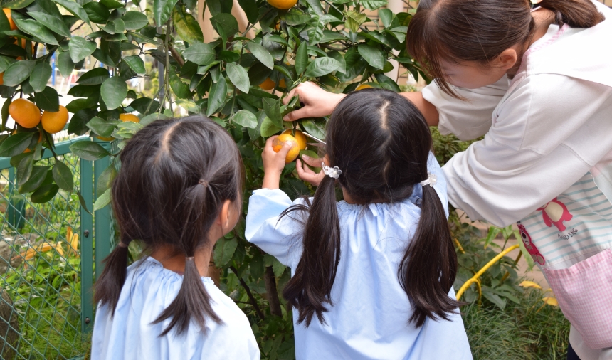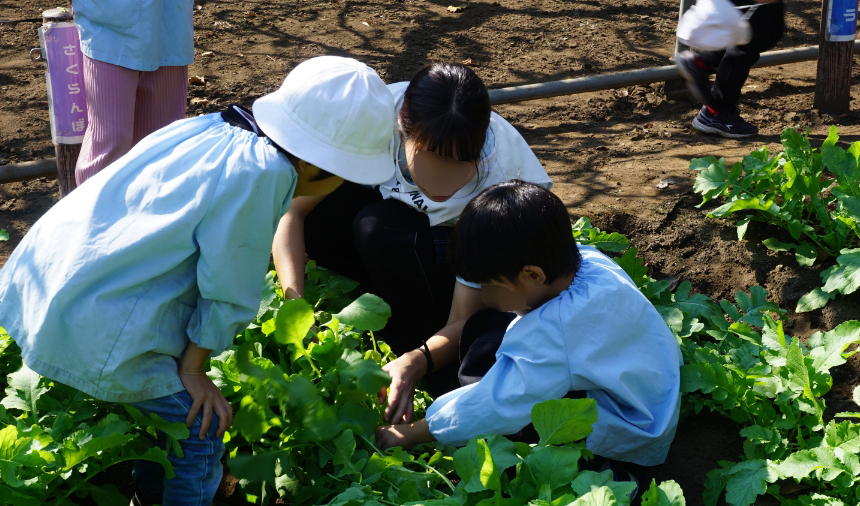 農園や果樹園でさまざまな野菜や果実の栽培に取り組んでいます。子どもたちが土に触れ、種をまき、水をあげ、成長を見守ることで、命の大切さを学びます。また、育てた野菜を収穫し、食べることで食への感謝の気持ちも育まれます。自然の中で学ぶ喜びを通して、子どもたちの心を育てていきます。