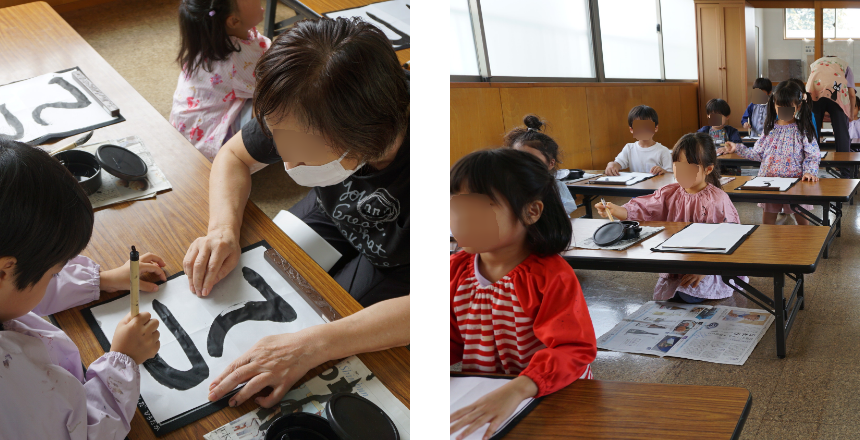 書道家の指導で、一本の筆を使って滑らかに文字を書く楽しさを体験しながら、正しい書き方を学びます。正座や本物の墨汁、筆、半紙を使うことで、落ち着いて集中できる子どもに成長していきます。
