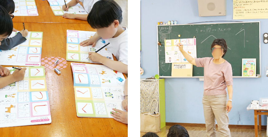 元小学校の先生が、話を聞く姿勢や鉛筆の持ち方から丁寧に教えます。言葉を覚え、文字が書けるようになる楽しさを実感できます。