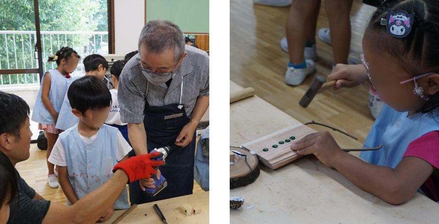クギ、トンカチやドリルなどの道具を使い、木片や木の枝、切り株などを材料に自由なイメージを働かせて製作します。(このようにして、手先の巧緻性を養います)
