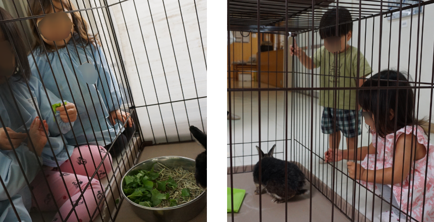 ウサギ、烏骨鶏、インコ、亀などの動物を飼育し、日々の世話を通じて命の大切さを学びます。