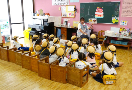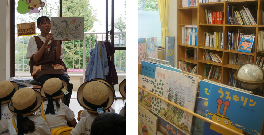 読み聞かせは、こどもたちの言語力や感受性を育む大切な時間です。決まった時間以外にも、あらゆる場面で読み聞かせを行い、年間数百冊の本を通じて、想像力や思考力を豊かに育てています。