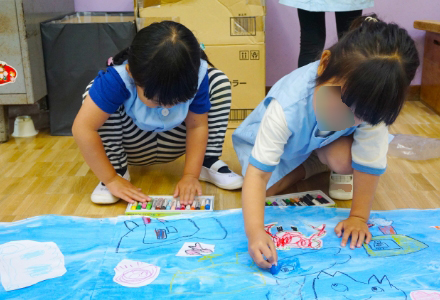 主活動 全員揃ったら朝の挨拶をし、クラスでの活動に入ります。座って行なう制作、ダイナミックな絵具あそび、運動あそびなど、多様な体験ができます。 |