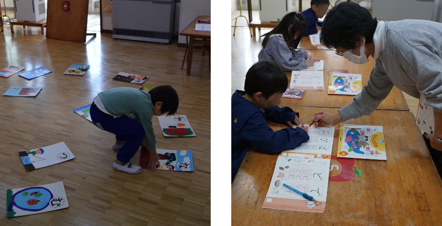 年中組では、文字を書く基礎になる「線」を指さし動作で描くことを中心に、年長組では「文字」の形を見て書くことに慣れるなど小学校では十分出来ないことをしつかり学びます。